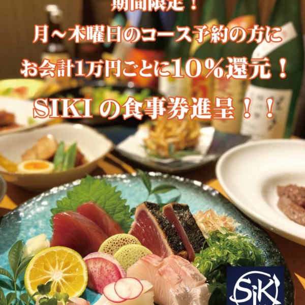 月~木曜日のコース予約の方に10000円毎に10%のお食事券をプレゼント中!!